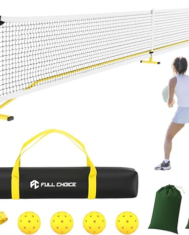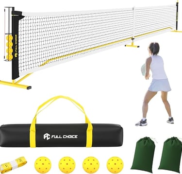 FULL CHOICE Rede portátil para pickleball, dimensões padrão IPF, suporte conveniente para pickleball, materiais de qualidade, aparência simples, contém 4 bolas amarelas